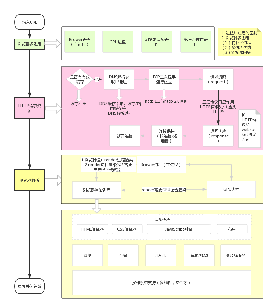 - GUI渲染线程:负责渲染浏览器界面,解析HTML,CSS,构建DOM树和RenderObject树,布局和绘制等。与JS引擎线程互斥
